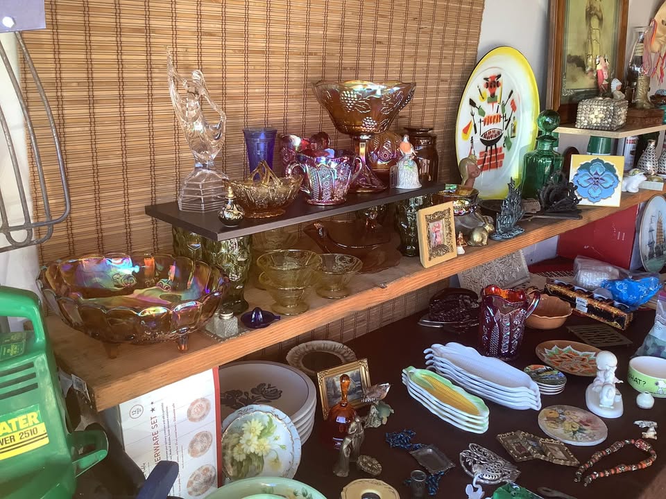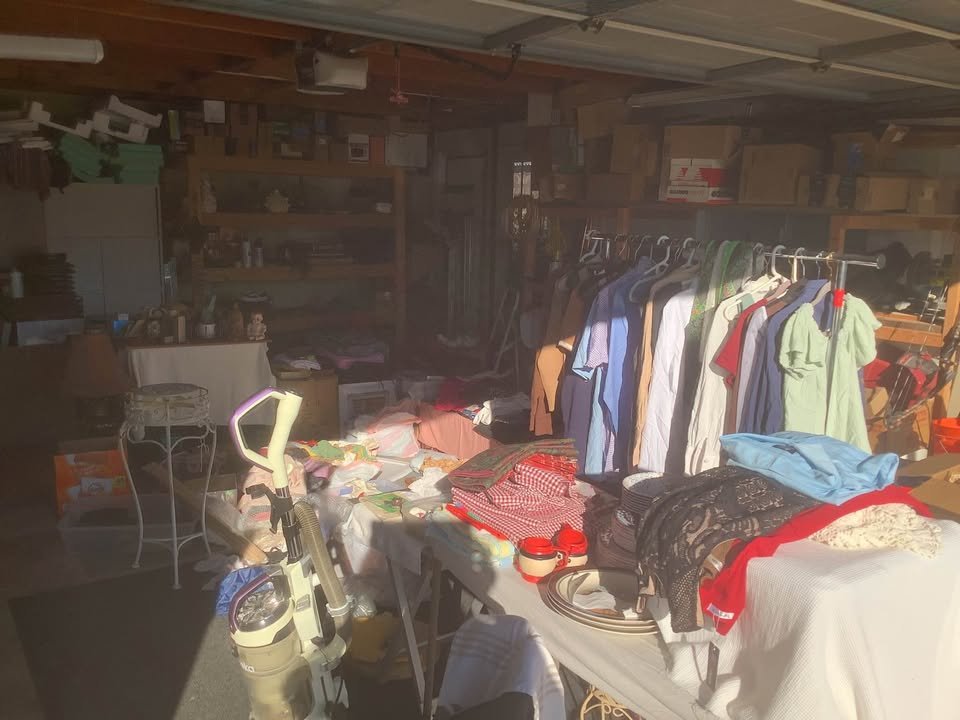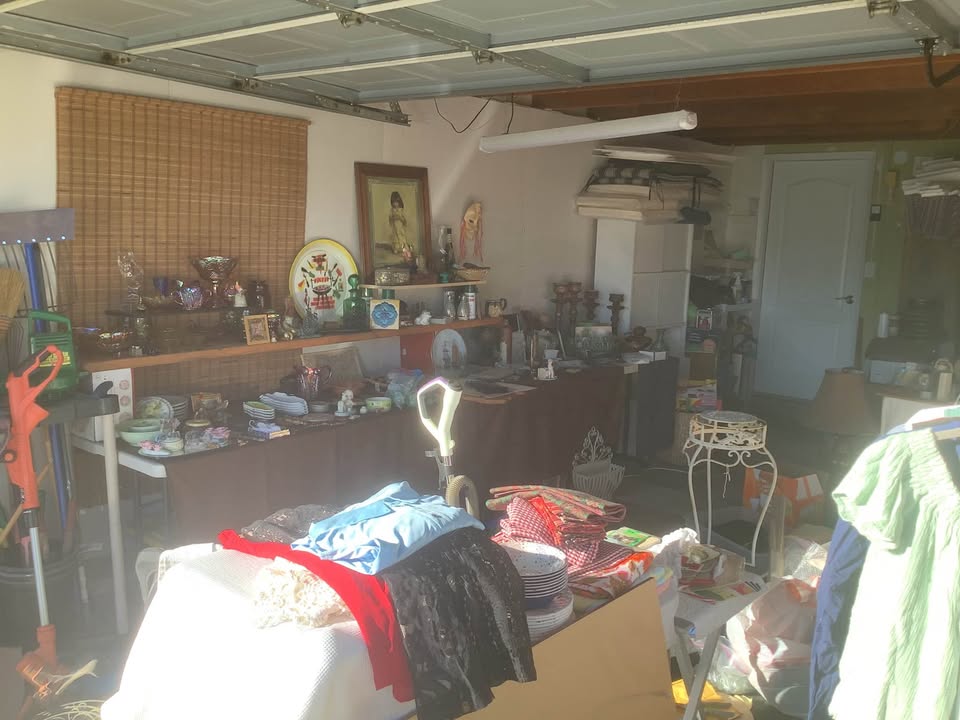 Setting up. It’s a mess. Better picture tomorrow. It will be on Casa Grande Avenue in Rocklin. I’m an early bird so I’ll be ready to sell at 7:00. Vintage. Vintage. I have loads and loads of clothes, various sizes, mostly women’s, some men’s. $1.00 each. More than half of them are new with tags. I probably have about 50 swimming suits that are new. Various sizes. Mostly extra large & medium. Modest & bikini. I’ll ask my husband about some tools but no guarantees.